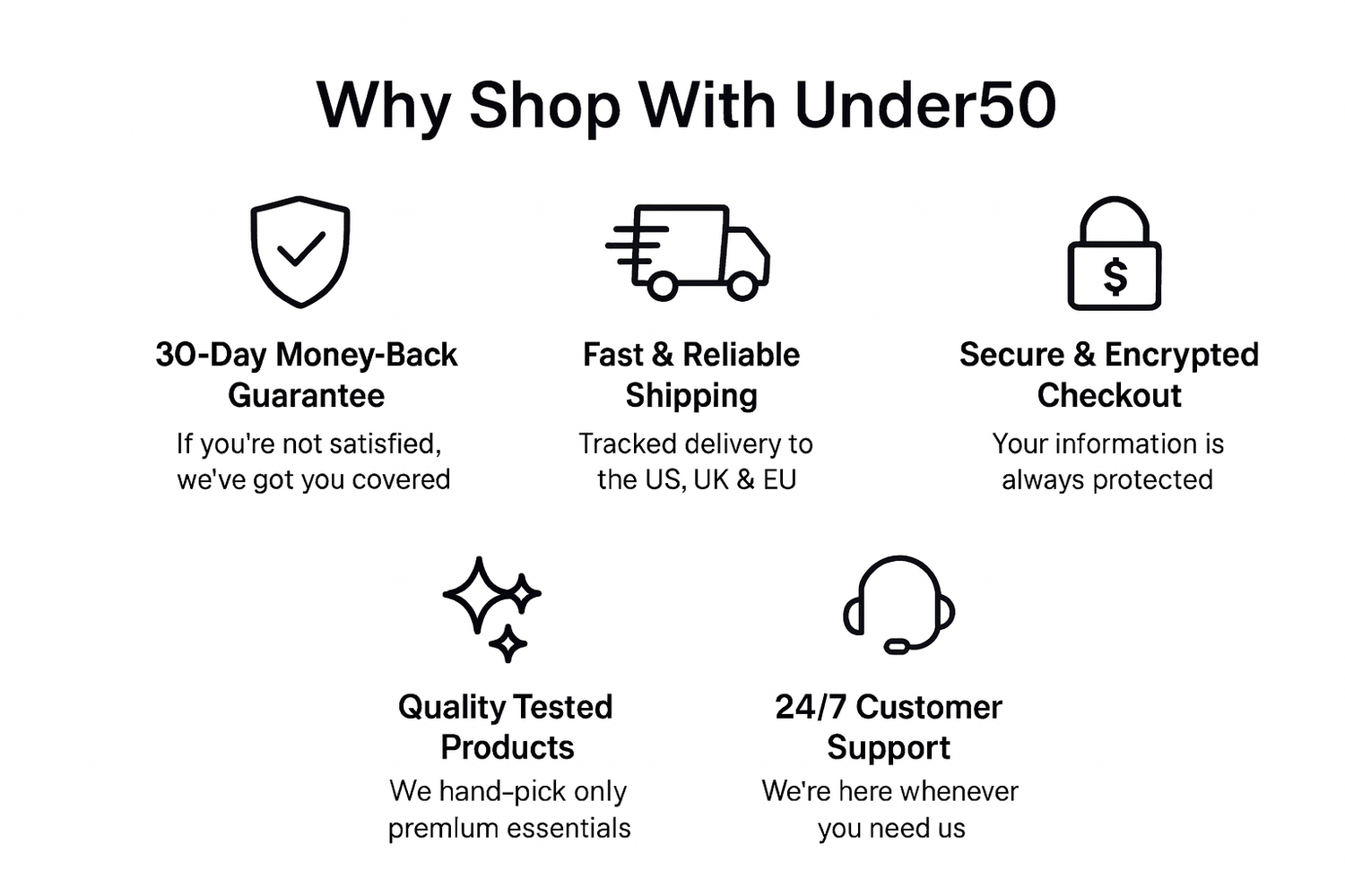 At Under50$, we carefully select high-quality, trending products trusted by customers across the US, UK, and Europe. Our mission is simple — deliver premium value, fast shipping, and a safe shopping experience you can trust, all for under $50.